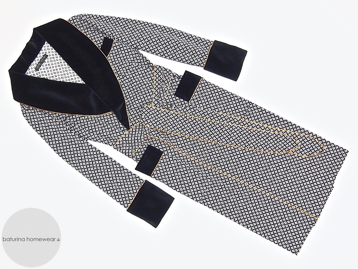 Men's geometric patterned jacquard cotton dressing gown with dark navy velvet shawl collar and elegant gold piping. Unlined and warm classic dressing gown that will last for many years to come.